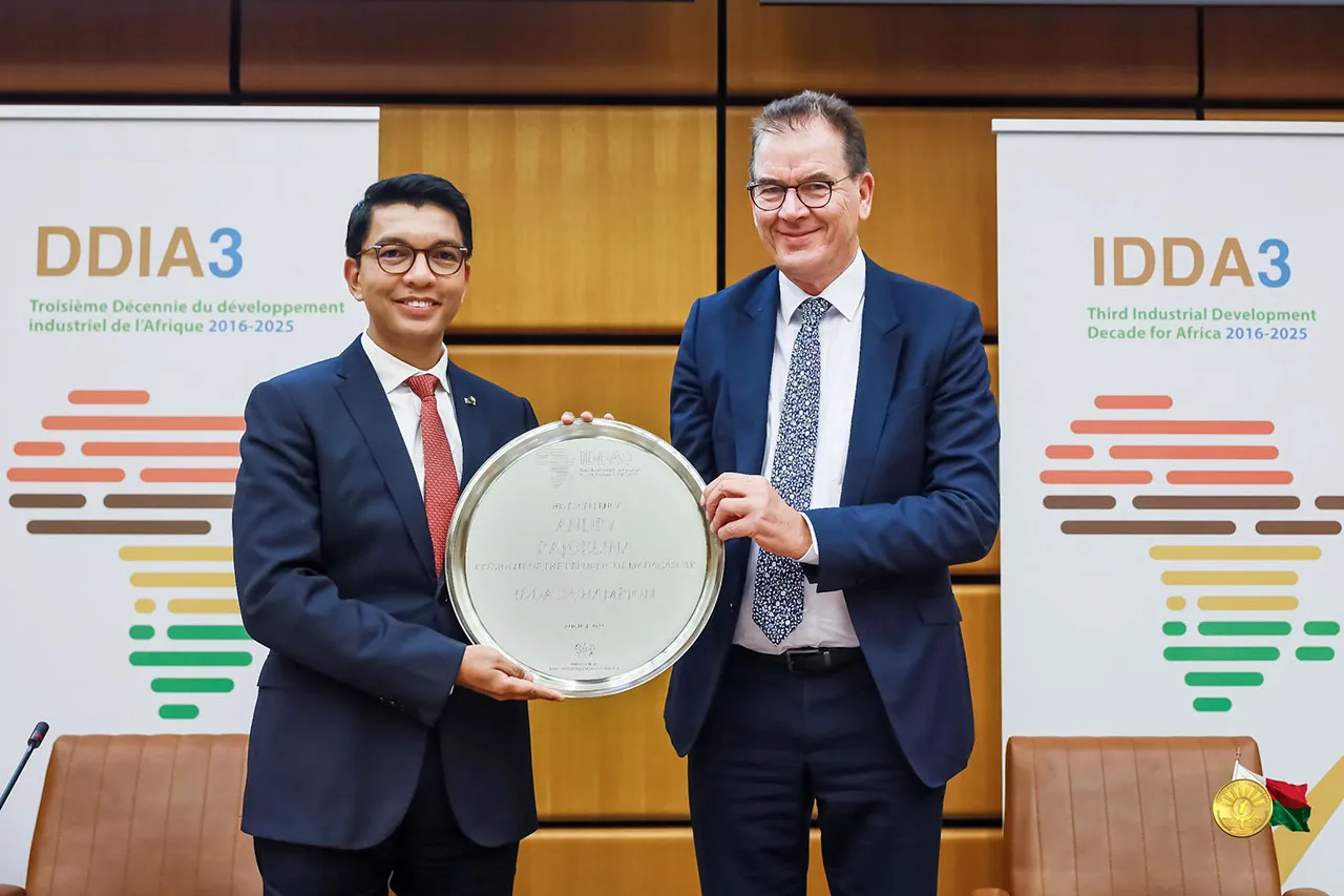 La Organización de las Naciones Unidas para el Desarrollo Industrial (ONUDI) entregó el viernes 12 de agosto el premio Campeón de la Industrialización en África al presidente de Madagascar, Andry Rajoelina, durante una ceremonia organizada al efecto en Viena, capital de Austria.